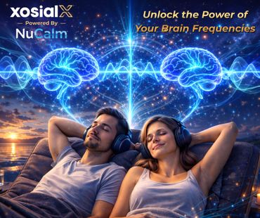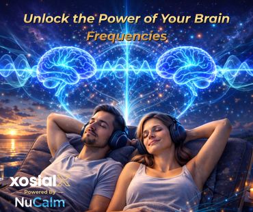 Two people meditating with brainwave graphics and text about unlocking brain frequencies.
