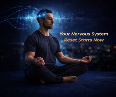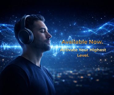 Man meditating with brainwave graphics and text about unlocking brain frequencies.